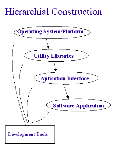 Thus far the system construction is implemented in hierarchical fashion with the operating system at the lowest level. The figure represents a process flow that constructs a software system. We observe that preliminary efforts to construct the appropriate product definition is to select the operating platform, the necessary utility libraries, possibly an application interface, and the needed development tools. These decisions are necessary prior to development of the product definition.