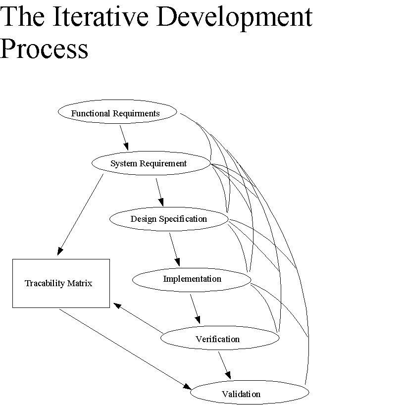 As this description of the iterative development process evolves, figure ?? is generated.We observe that the ordered sequence of events are the establishment of the project deliverables (system requirement, design specification, implementation, verification, and validation). Ordering of the requirement set is important and necessary. The initial architectural design must accommodate all functional requirements, but only sufficiently to allow implementation to validate the set of requirements declared as primary. Subsequent iterations of validation efforts occur as the system construction implements the associate requirement. The final iteration with this development process declares all requirements stipulated by the tracability matrix are validated.